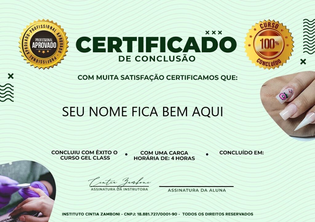 Esse certificado é válido como comprovação de aprendizado e pode ser utilizado para apresentação a clientes, divulgação dos seus serviços e fortalecimento da sua imagem como nail designer.